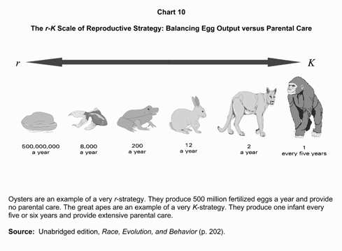 Harvard University biologist E.O. Wilson was the first to use the term r-K Life-History Theory. He used it to explain population change in plants and animals. I have applied it to the human races. A life-history is a genetically-organized group of traits that have evolved together to meet the trials of life -- survival, growth, and reproduction. For our purposes, r is a term in Wilson's equation that stands for the natural rate of reproduction (the number of offspring). The symbol K stands for the amount of care parents give to insure that their offspring survive. Plants and animals have different life history strategies. Some are more r and others are relatively more K. The r and K strategists differ in the number of eggs they produce. The r-strategists are like machine-gunners. They fire so many shots that at least one of them will hit the target. The r-strategists produce many eggs and sperm, and mate and give birth often. The K-strategists, on the other hand, are like snipers. They put time and effort into a few carefully placed shots. K-strategists give their offspring a lot of care. They work together in getting food and shelter, help their kin, and have complex social systems. That is why the K-strategists need a more complex nervous system and bigger brain, but produce fewer eggs and sperm. This basic law of evolution links reproductive strategy to intelligence and brain development. The less complex an animal's brain, the greater its reproductive output. The bigger an animal's brain, the longer it takes to reach sexual maturity and the fewer offspring it produces (see Chart 10). Oysters, for example, have a nervous system so simple that they lack a true brain. To offset this they produce 500 million eggs a year. In contrast, chimpanzees have large brains but give birth to one baby about every four years. In different species of plants and animals we find a consistent pattern between these two variables -- intelligence and reproductive rate. The number of offspring, the time between births, the amount of care parents give, infant mortality, speed of maturity, life span, even social organization, altruism, and brain size all fit together like pieces of a puzzle. The complete puzzle forms a picture biologists call the r-K Life History Strategy.